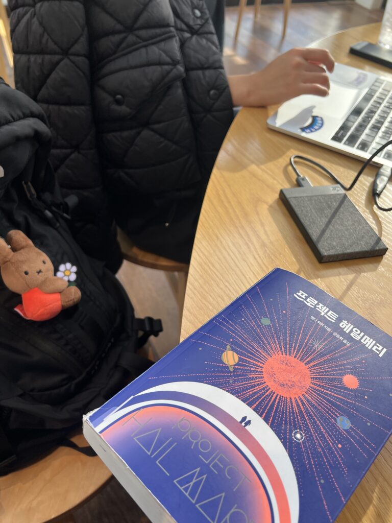 합정 콤마로 출근! 망원에 사는 프리랜서 창업가인 친구와 열일하기. 콤마 너무 좋음. 개인적으로 몰입 잘 되는 작은 공간보다 넓고 개방감 있는 공간을 선호하고, 그 중에서도 층고가 높고 창이 있는 공간을 제일 좋아하는데 콤마 1층과 2층이 딱임. 오래 있어도 눈치 안 보이는 카공족들에게 굉장히 좋은 공간! 배고플 때 먹을 수 있는 빵/디저트류도 다양하고 집중 안될 때 머리 식힐 수 있도록 책들도 다양하게 있다. 요즘 핫한 프로젝트 헤일메리도 잘 찾아보면 있어서 읽어볼 수 있음.